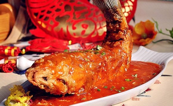 鲤鱼跃龙门 寓意对来年的期望和祝福,火红的颜色,翘翘的鱼尾,给人感觉生龙活虎且喜气洋洋~ 大年夜的餐桌上最应景最具寓意的就是它。 《埤雅·释 鱼》:“俗说鱼跃龙门,过而为龙,唯鲤或然。” 鲤鱼跃龙门,寓意对来年的期望和祝福:奋发向上,连年有余!! 这道菜还叫糖醋鲤鱼,鲤鱼首选金背红尾的大鲤鱼,色泽喜庆,肉质鲜嫩,美而淳厚。油炸成脆皮后浇糖醋汁上桌,外焦里嫩酸酸甜甜的,风味极佳!更多特色湘菜美食就在刘石强湘菜名厨网 .