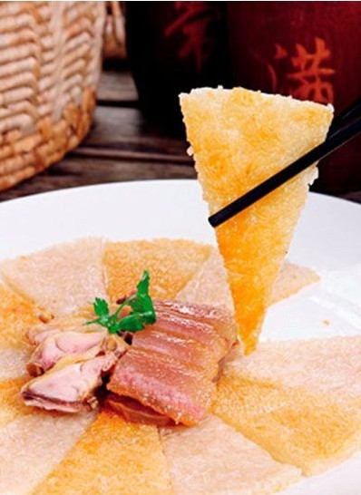 走菜:锅内放入熟猪油和色拉油各75克,小火熬化后将糯米圆饼平铺入锅内,一边用小火煎制,一边不停地晃动炒锅,待糯米一面呈现色泽金黄时,取出修整边缘,切成三角形大块。正反两面交叉摆入盘中,放入蒸熟的咸肉、香肠(或咸鸭),再将蒸咸肉、香肠(或咸鸭)产生的汁水淋在煎好的糯米锅巴上,用葱丝5克,胡萝卜丝、青椒丝各2克(或香菜4克)装饰即可。更多特色湘菜美食就在刘石强湘菜厨师团队。