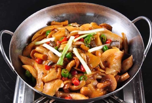 原料:野生菌500克,五花肉100克,红椒25克,蒜片5克,葱3克。更多特色湘菜美食就在刘石强湘菜厨师网。