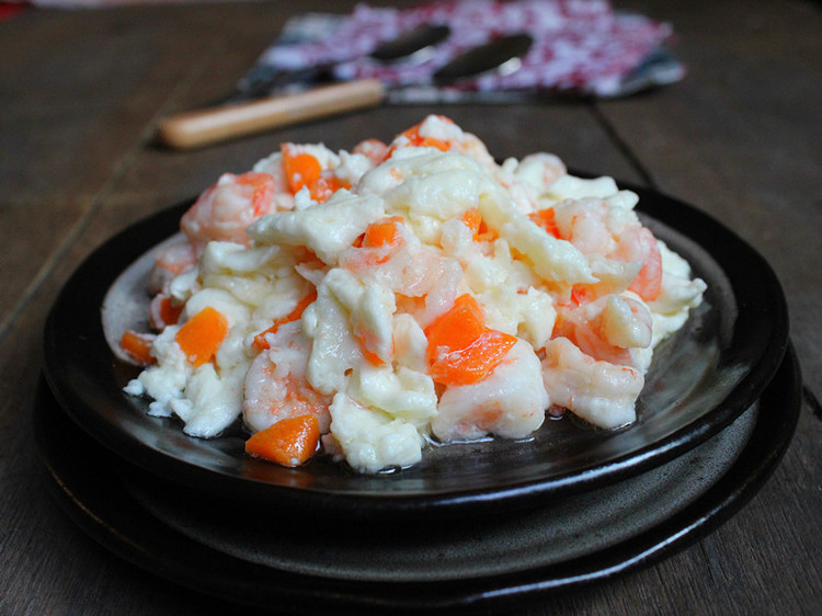 牛奶200克、虾仁50克、鸡蛋白5个、淀粉10克、色拉油3汤匙、食盐适量、白糖1克