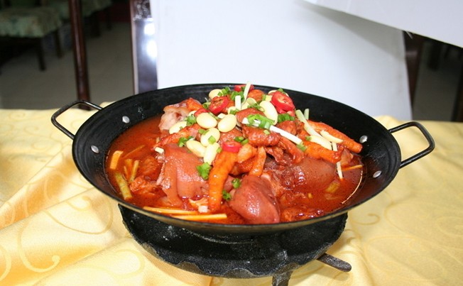 制作过程:1、猪脚斩件,过水去腥。锅入20克色拉油,放入白糖炒至有气泡冒出时,加200克清水,熬成糖浆。将猪脚煸炒2分钟出油后,上糖色,制成半成品,八角、桂皮、整干椒炒香,用盐调味后,用高压锅压6分钟。肥肠处理干净,入湘味卤水锅中,小火卤25分钟后切段。凤爪去爪尖,上糖色,油炸至金黄色,放入湘味卤水中泡半小时备用。蒜籽过油,放姜片、大蒜、辣妹子、蚝油、料酒、豆瓣酱、胡椒粉、味精炒香,再下入肥肠、猪脚、凤爪,加部落秘汁调味煨至入味,勾稀芡淋油出锅。更多特色湘菜美食就在刘石强湘菜厨师网。