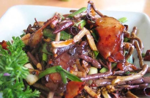 原料:风吹肉350g ,卜蕨菜100g、干椒节、蒜茸、蒜叶、精盐、味精、料酒、酱油、蚝油、红油、香油