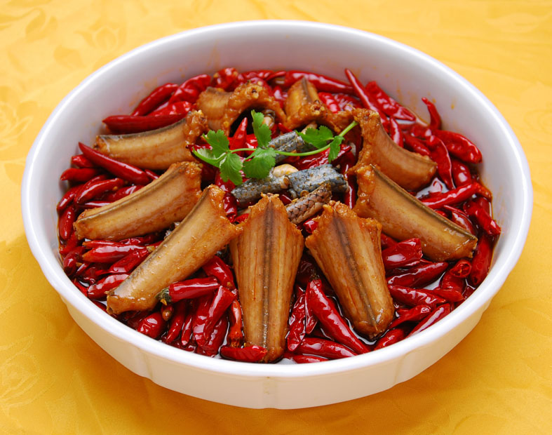 制作方法: 将蛇宰杀,与皮一起斩成3厘米长的段,五花肉切成2厘米的片。 下油将五花肉炒香,然后把五花肉挑出,加入生姜、花蛇、下入盐、味精、豆瓣酱、辣妹子辣酱、花生辣酱入高压锅压4分钟。 锅内放入色拉油烧至5成热,放入尖红椒和压好的花蛇,旺火炒3钟,淋香油即可。
