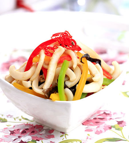 原料:黄鱼鲞1条(重约400克),袋装鱿鱼丝250克,彩椒条50克。