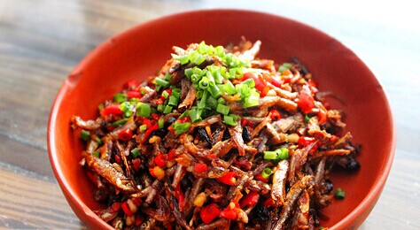 制作:把小毛鱼300克宰杀洗净,用盐、十三香各1克腌制5分钟,放笊篱上,拌上一层薄淀粉20克,入四成油温中炸至金黄干香,撒上葱丁、姜片、花椒、干红辣椒节各5克,浇上用高汤200克,盐2克,胡椒粉、十三香、老抽各1克烧成的味汁,入蒸车内旺火蒸至30分钟后取出扣入大碗内,淋芝麻油2克,撒香葱丝3克即成。