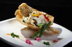 湘菜厨师网 刘石强餐饮管理有限公司荣誉出品 造型新颖的 双味多宝鱼 。将鱼骨炸成盛器,独具匠心中又见其深厚的火候功夫。 炸鱼骨时,火候不到,炸成的鱼骨容器容易塌陷,影响...