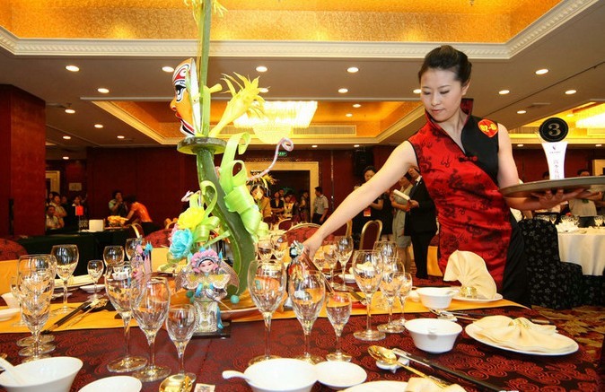 4.2.3.9 花瓶的摆放:花瓶摆放在餐台正中或边角处,具体位置根据餐厅情况而定。