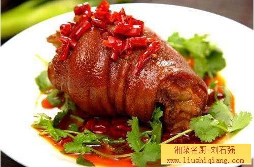 注:肘子经过2小时的蒸制后,肉质非常软烂。菜肴上桌后,由服务员将肘子切开,蘸味料食用。