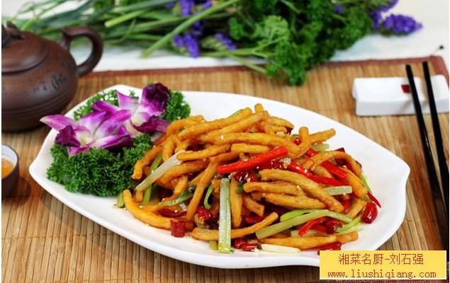 特别需要注意的是,当鱿鱼丝开始卷曲时,要及时烹入料酒,并迅速加入码过味的生瘦肉丝一起煸炒,待将肉丝水分煸干时,加入其他辅料,调入盐、味精、糖炒香,更多特色菜就在刘石强湘菜厨师网。这段过程是“火中取宝”的关键,切忌在锅内久煸,否则鱿鱼在高温下外形干瘪,口感变老。